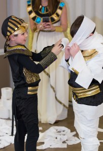 The second-grade students at Westminster Academy celebrated their study of ancient Egypt with a magnificent Egyptian feast last week. Bringing history alive with the feast helps to engage the students and solidify the lessons they’ve learned so far this year. “It has been my experience that second graders get very excited about all things Egypt,” said Mrs. Boyd. “Mighty pharaohs and magnificent pyramids truly engage the imagination.” To help bring some of their lessons to life, the students used several pieces of their class artwork, including hieroglyphic banners and paintings of Egyptian people, as decorations for the event. There were also activities and games, including pyramid building and “mummification”.